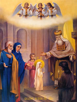 Із введенням Богородиці до храму наблизився час спасіння людства, наблизилося царство Боже, що передрік також архангел Гавриїл, чий образ зустрічаємо у стихирах. Зазначимо, що Гавриїл постає не тільки як посланець, звіщающий Благу Вість, але як духовний кормитель Діви: